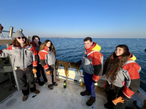 The answer? The buoys and lines are in place and the kelp is growing well. Cold for us is not necessarily cold for kelp as long as it stays below the surface of the water. Sugar kelp thrives in cold, nutrient-rich water so while it was unusually cold for us here, kelp has been known to even grow under ice in places like Alaska. Worse for kelp than extreme cold is high heat which destroys tissue and can lead to fouling and being out-competed by other algae.